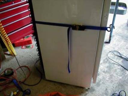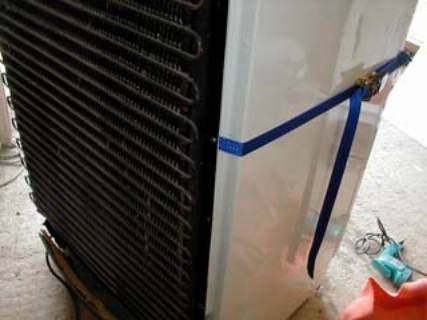 Easy enough to fix with a ratchet strap put under one of the screws holding the condensing coil frame on the rear. |