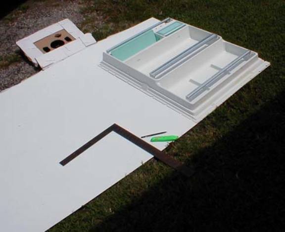 The panel was then used as a template against the 4'X8' sheet of fiberglass shower wall. I traced around the top and side with a pencil, then with some cardboard box as a backing (I had it left from the water heater I had replaced a couple of weekends earlier) I used the square and razor knife to score the line I had marked. The fiberglass can then be flexed and will break along the scored line.