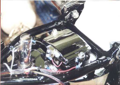 A coat of spray-bomb black helps conceal the support. Although the chromed top came with 2 sponge rubber strips to help prevent it shorting the battery terminals, I thought they were kind of thin and replaced them with another section of the 3/8" rubber pad. The main circuit breaker is mounted to the front of the top.