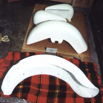 The fenders and tanks are back from John Snider at Razor Sharp in Gleason TN, here they are before they got the trim put on and the associated scratches from mounting to the frame and forks. There has to be a way to get them on without marring them up, but I haven't figured it out yet...