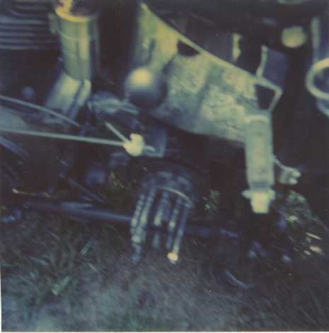 Check out my cool clutch lever for the suicide set up. That was a piece of flat stock welded to a standard hand clutch lever, drilled for a piece of wire rope and a clamp to hold it on. The cable ran to a foot shift lever which I used for a pedal. The ball thing above it was the shift knob on the jocky lever. |