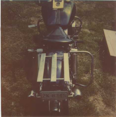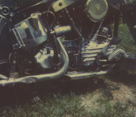 Blew the dust off of these photos. These pictures were taken with a Polaroid camera after I had the altercation with a Chevette. I was behind a pickup w/camper shell that was turning right onto a side road off a 2 lane. I went to pass, but the Chevette was coming out of the side road and turning left onto the 2 lane... *Couldn't see the motorcycle* because of the camper. I guess she couldn't HEAR me either, check out the unmuffled drag pipes I had on at the time. The flat spot on the rear one was when I slid under the car. I went down on the right side, the crash bars took the brunt of the slide. Note the leather saddlebags, before I got the fiberglass ones. A friend gave them to me, they were originally for a horse, but I cut a section out of the middle and strapped it back together with bootlaces. They were natural roughout, but I took black shoe dye to them. The bike was supposed to be painted blue, but I guess the kid at the autoparts didn't know how to mix. I think he gave me a can of blue base. Anyway, when I came back after dropping the paint, tanks and fenders off at a painter friends, the shade was a dark purple. |
